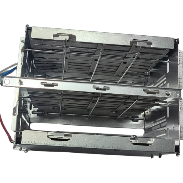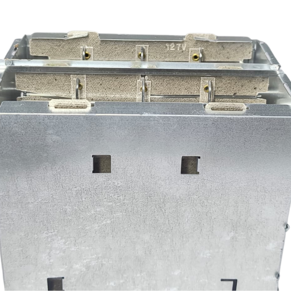 A peça combina a estrutura do cesto que acomoda as fatias de pão com os elementos de aquecimento (resistência). É responsável por gerar o calor necessário para tostar o pão de forma uniforme e segura, garantindo o funcionamento correto do aparelho quando a resistência antiga se desgasta ou queima.